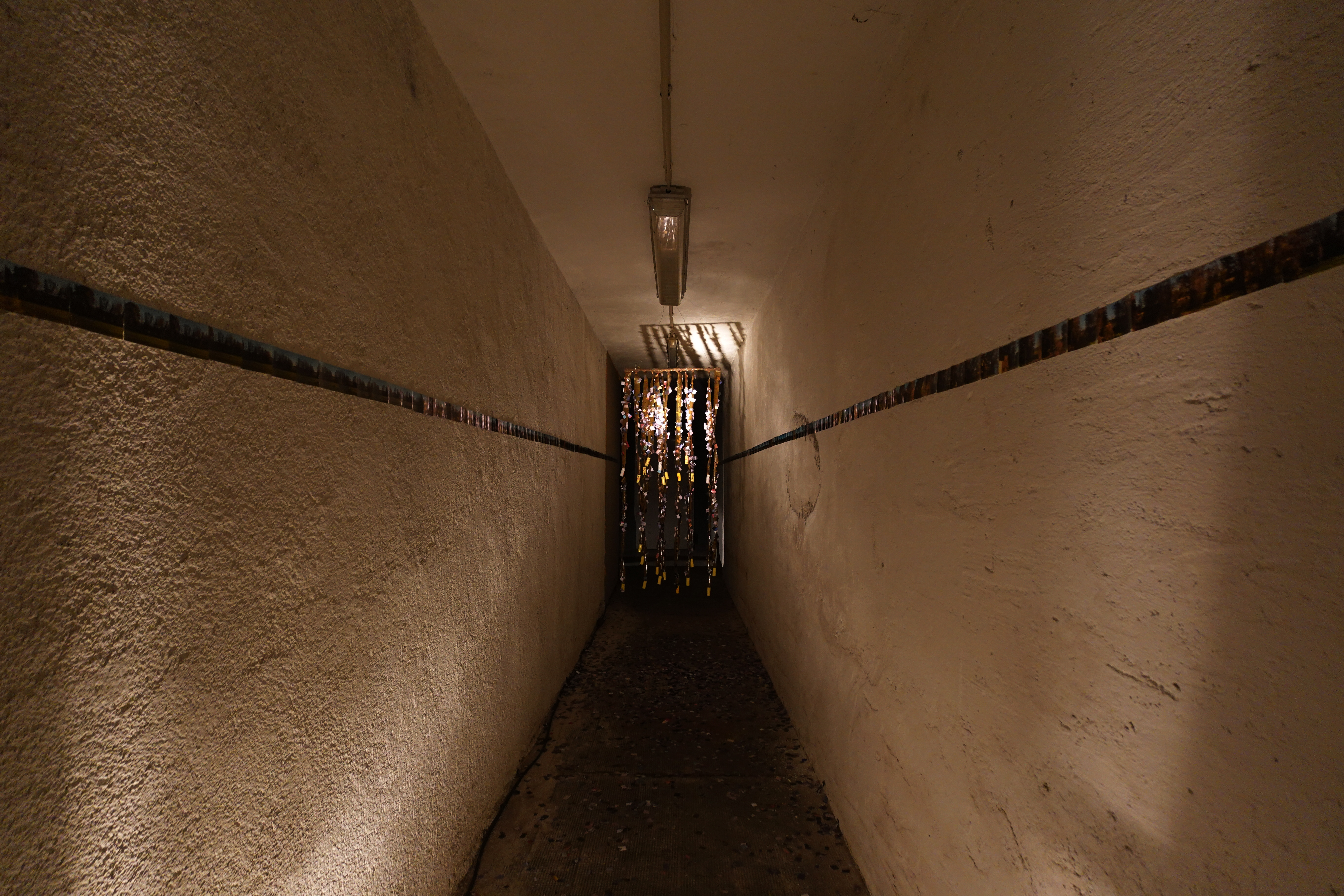 The installation is set in the middle of another work, a continuous flow of captures travel. Images are broken down into tiny pieces, those are not trapped in the fly catcher scatter all over the floor. Accompanied by a sound of more fragmentations, flickering in the ear, pacing over countless parts.